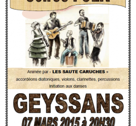 Soirée FOLK Animée par « LES SAUTE CARUCHES » Accordéons diatoniques, violons, clarinettes, percussions / Initiation aux danses Participation 6 EUR. Organisée par l’association culturelle et sportive « LES JONGLEURS » 26750 GEYSSANS
