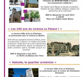 Le Service Ville d’Art et d’Histoire vous invite à découvrir MONTMEYRAN par ses monuments religieux (19 avril) Les 100 ans du cinéma Le Palace! (3 mai) Haïnots, le quartier arménien (9 mai)