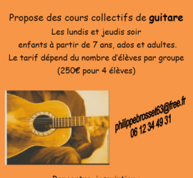 Philippe BROSSET avec l’association “ les Jongleurs“ de GEYSSANS Propose des cours collectifs de guitare Les lundis et jeudis soir: enfants à partir de 7 ans, ados et adultes. Le tarif dépend du nombre d’élèves par groupe (250€ pour 4 élèves) Rencontre, inscription : Lundi 11 septembre 2017 de 17h à 19h ( salle des associations, à côté de la mairie ) Contacter Philippe Brosset: philippebrosset63@free.fr / 06 12 34 49 31