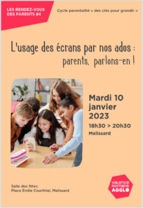 Pour rappel, le prochain Rendez-vous des parents aura lieu le mardi 10 janvier et traitera de l’usage des écrans par les ados. Vous trouverez en pièces-jointes le flyer et l’affiche pour relayer l’information, ainsi que le flyer trimestriel annonçant les prochains rendez-vous de janvier, février et mars 2023. Ces rendez-vous aborderont à chaque fois une nouvelle thématique abordée avec un professionnel pour donner aux parents des clés pour aider leur enfant à bien grandir : motricité, éveil, alimentation, gestion des émotions, lien parents-ados… Ces rendez-vous sont gratuits et tournent sur l’ensemble du territoire de l’Agglo. Ils sont ouverts à tous et un espace garderie est proposé pour les enfants de moins de 10 ans.