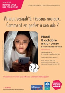 Le prochain Rendez-vous des parents aura lieu ce mardi 8 octobre 2024 à 18h30 à Beaumont-lès-Valence et aura pour thème : « Amour, sexualité, réseaux sociaux, comment en parler à son ado ? «